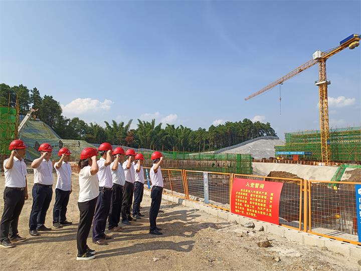 “我志愿加入中國共產(chǎn)黨,擁護(hù)黨的綱領(lǐng),遵守黨的章程,履行黨員義務(wù),執(zhí)行黨的決定……”項(xiàng)目建設(shè)施工現(xiàn)場,黨員們面對莊嚴(yán)的黨旗,重溫了入黨誓詞。