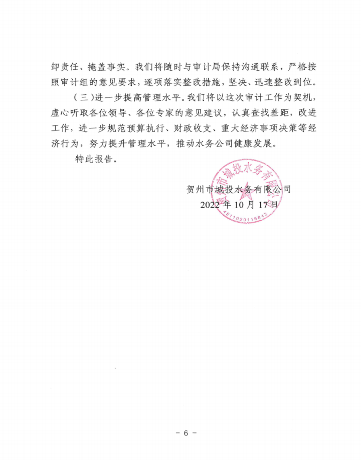 下一篇:城投水務(wù)公司關(guān)于賀州市本級(jí)2021年度預(yù)算執(zhí)行和決算草案審計(jì)項(xiàng)目審計(jì)查出問(wèn)題和整改