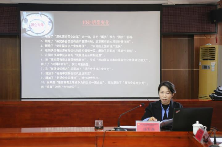 為全面學(xué)習貫徹黨的二十大精神,推動支部黨員在深化國企改革中展現(xiàn)新?lián)斝伦鳛椋?月24日,城投集團機關(guān)第一黨支部組織開展2023年第一季度主題黨課活動。支部書記湯彩燕以《解讀二十大報告:國企改革的新部署新特點》為題,為支部黨員、入黨積極分子講授了一堂生動黨課。集團黨委副書記梁輝露,外部董事鄒雄斌、莫衍鑒以普通黨員身份參加黨課。
