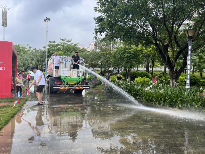 本次清理行動(dòng)分兩組進(jìn)行,一是加大路面保潔作業(yè)力度,對(duì)散落的樹枝、落葉及洪水?dāng)y帶上來的雜物進(jìn)行清理。二是人機(jī)結(jié)合,采取“沖洗+洗掃”聯(lián)合作業(yè)方式,對(duì)林蔭小道路面、公園廣場等地進(jìn)行深度沖洗,徹底消除洪水沉積淤泥。